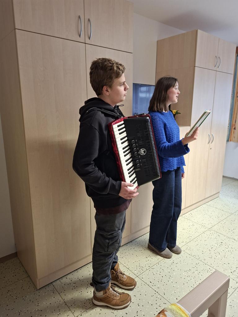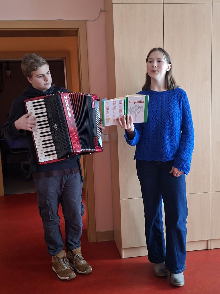 Společně navštívili pokoje babiček a dědečků, kde hráli a zpívali nejen připravené písně, ale také skladby na přání. Někteří senioři se přidali a zpívali společně s nimi. Hudba tak vytvořila velmi příjemnou a srdečnou atmosféru, která vykouzlila úsměvy na tvářích všech přítomných. Mezi nejoblíbenější písně patřily například Od Tábora až k nám, Ještě já se podívám, Já jsem malý mysliveček nebo Co jste hasiči… Vystoupení mělo u posluchačů velký úspěch a bylo odměněno vřelým potleskem a poděkováním. Setkání bylo obohacující nejen pro seniory, ale i samotné žáky, kteří si odnesli krásný pocit z toho, že mohli druhým udělat radost. Díky pozitivním ohlasům jsme se domluvili na dalším vystoupení v měsíci únoru, na které se už teď všichni těšíme.