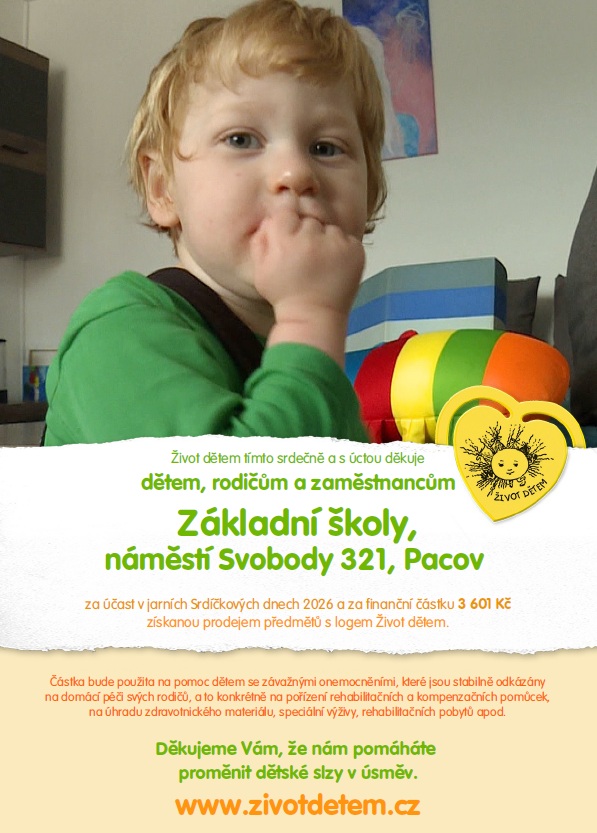 Díky jejich snaze a ochotě pomáhat se podařilo vybrat částku 3 601 Kč, kterou jsme následně odeslali na podporu vážně nemocných dětí. Do prodeje se aktivně zapojili žáci 6. a 7. třídy, kteří si vyzkoušeli komunikaci s lidmi, učili se správně jednat se zákazníky, počítat peníze i vracet drobné. Především však udělali dobrý skutek a přispěli na pomoc těm, kteří to nejvíce potřebují. Na přiložených fotografiích jsou zachyceni právě ti žáci, kteří se o prodej zasloužili. Velké poděkování patří všem – jak kupujícím, tak i našim malým prodejcům.